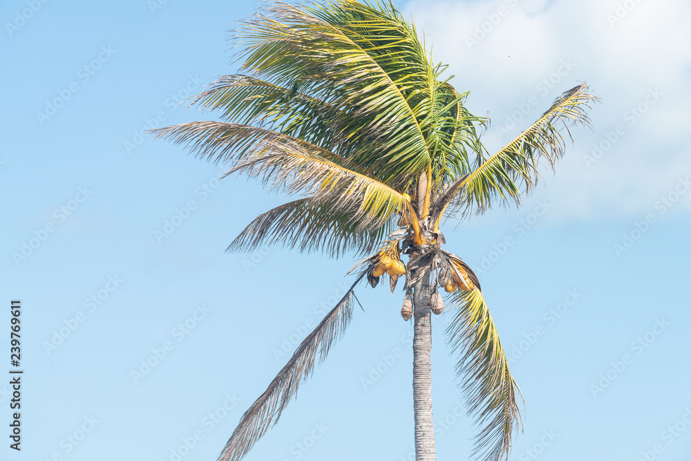 Closeup Of One Colorful Orange Yellow Bright Palm Tree Leaves Green Unripened Coconuts Fruit Branches Isolated Against Blue Sky In Miami Florida During Sunny Day Stock Photo Adobe Stock